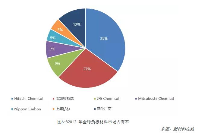 負極材料產(chǎn)業(yè)集中度極高,表現在區域集中和企業(yè)集中。區域看,中國和日本是全球主要產(chǎn)銷(xiāo)國,總量占全球負極材料產(chǎn)銷(xiāo)量95%以上。從企業(yè)來(lái)看,日立化學(xué)占全球市場(chǎng)份額的35%,深圳貝特瑞占全球份額的27%,其次分別是JFE、三菱化學(xué),市場(chǎng)份額分別9%、7%。全球前四大企業(yè)市場(chǎng)份額合計占比為78%,負極材料表現出高度集中化。