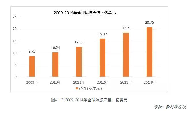 從產(chǎn)值來(lái)看,2014年全球隔膜的產(chǎn)值為20.75億美元,同比增速為12.18%,產(chǎn)值的增長(cháng)幅度明顯低于產(chǎn)量的增長(cháng)幅度。主要原因在于隨著(zhù)隔膜行業(yè)的逐步成熟,行業(yè)的技術(shù)壁壘逐步被突破,整體隔膜的平均價(jià)格呈現出下降的趨勢。