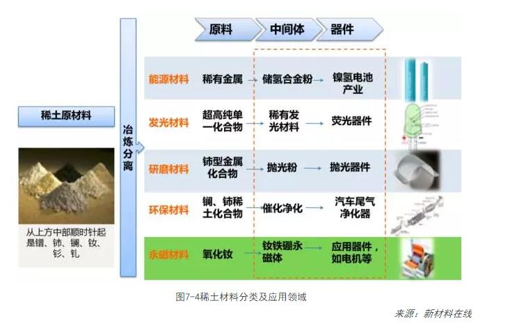 稀土又被稱(chēng)為“工業(yè)味精”,主要用做添加劑起到特殊功能的作用,應用領(lǐng)域十分廣闊。從產(chǎn)業(yè)鏈的角度來(lái)看,儲氫材料、熒光材料、拋光材料、環(huán)保材料以及永磁材料是稀土的主要應用領(lǐng)域。