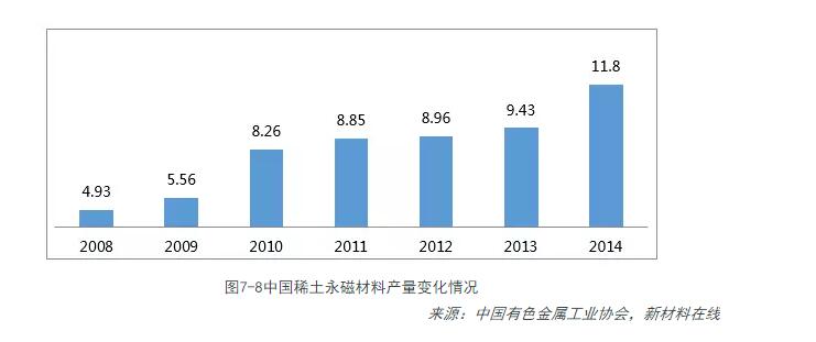 據中國有色金屬工業(yè)協(xié)會(huì )統計,2014年,中國稀土永磁材料產(chǎn)量合計11.8 萬(wàn)噸,同比增長(cháng)25%。以2013年為例,國內燒結釹鐵硼產(chǎn)量占93%。