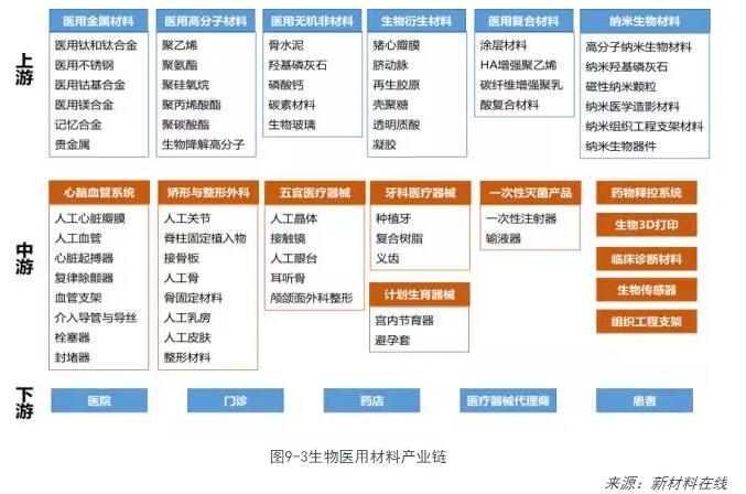 生物醫用材料涉及醫用高分子、醫用金屬和合金、醫用生物陶瓷、復合材料、生物衍生材料等,其制品既包括量大面廣的基礎醫療器械,如一次性使用的輸液及注射器具、一般性外科手術(shù)器具以及藥棉、繃帶、紗布等衛生用品,也包括技術(shù)含量高、附加值高的直接植入人體或與生理系統結合使用的材料及其終端產(chǎn)品,如人造血管、人工心瓣膜、心臟起搏器、骨修復和替換材料及器械、人工器官、牙科材料、藥物釋放系統等,以及臨床疾病診斷材料。下圖為生物醫用材料產(chǎn)業(yè)鏈。